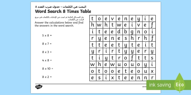 Multiplication 8 Times Tables Word Search Activity Sheet