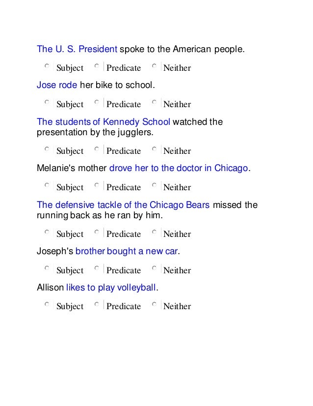 Some of the worksheets for this concept are Subjects predicates and objects, Subjects objects and predicates with pirates work, Subject verb agreement, Subjects predicates, Name date grammar work subject and object pronouns, Complete subjects and. Then, students write original sentences and identify their subjects, predicates, and objects. A sentence is a combination of words that gives a complete meaning or thought.