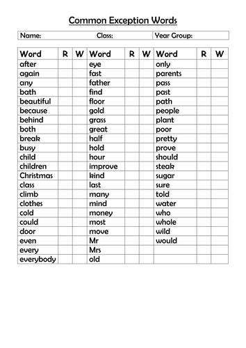 Year 2 Common Exception Words (in alphabetical order) by ...
