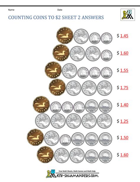 Counting Coins to $2 Sheet 3 Answers PDF version